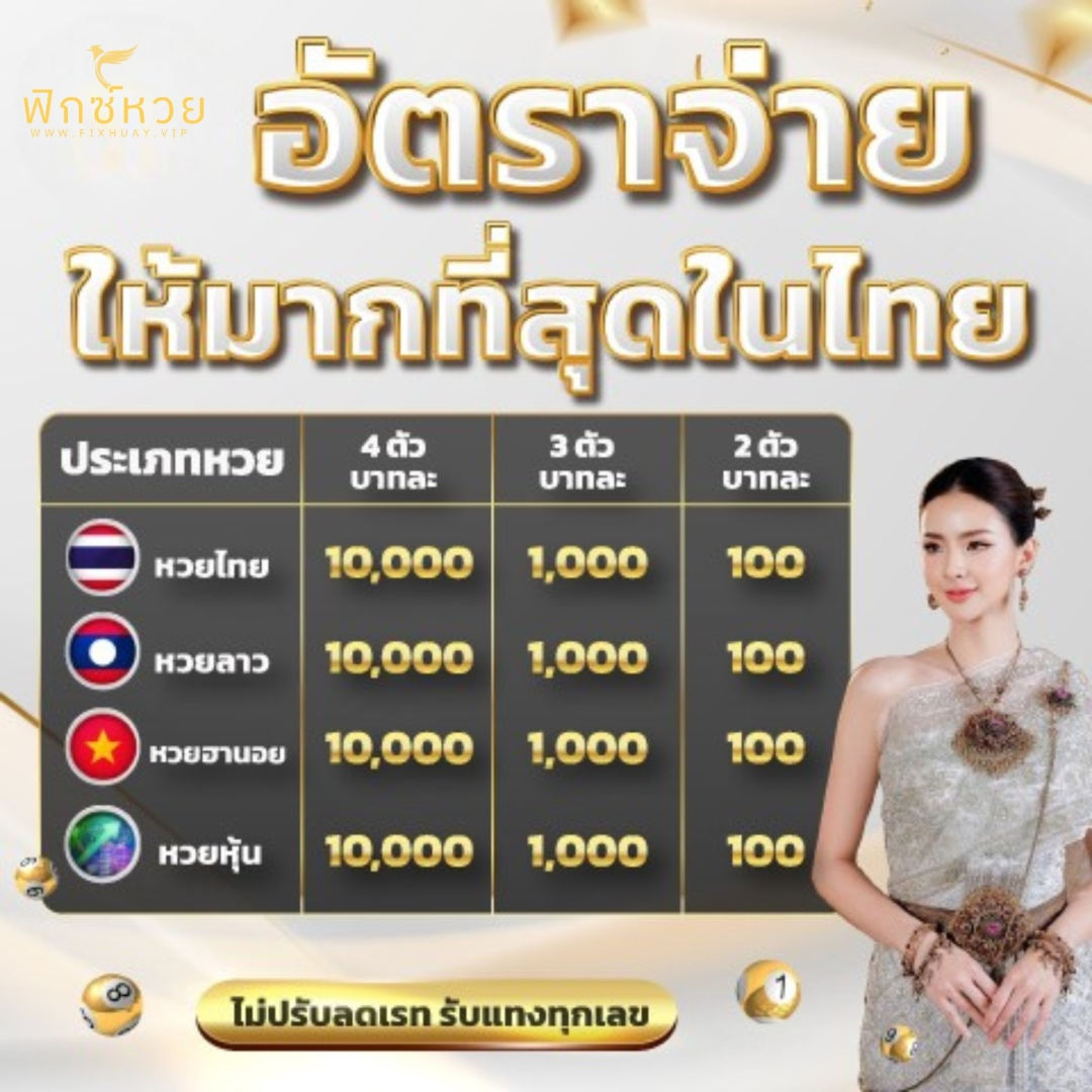 สำหรับหวยลาว หวยฮานอย และหวยมาเลย์ FixHuay ก็ไม่ทำให้ผิดหวัง ด้วยอัตราจ่ายที่แข่งขันได้ อยู่ที่ 850-900 บาท ซึ่งสูงกว่าเว็บอื่นที่จ่ายเฉลี่ย 750-850 บาท นอกจากนี้ ยังมีระบบสะสมแต้มที่สามารถนำไปแลกเป็นเครดิตเพิ่มได้ ทำให้อัตราการจ่ายจริงอาจสูงกว่าที่ระบุไว้